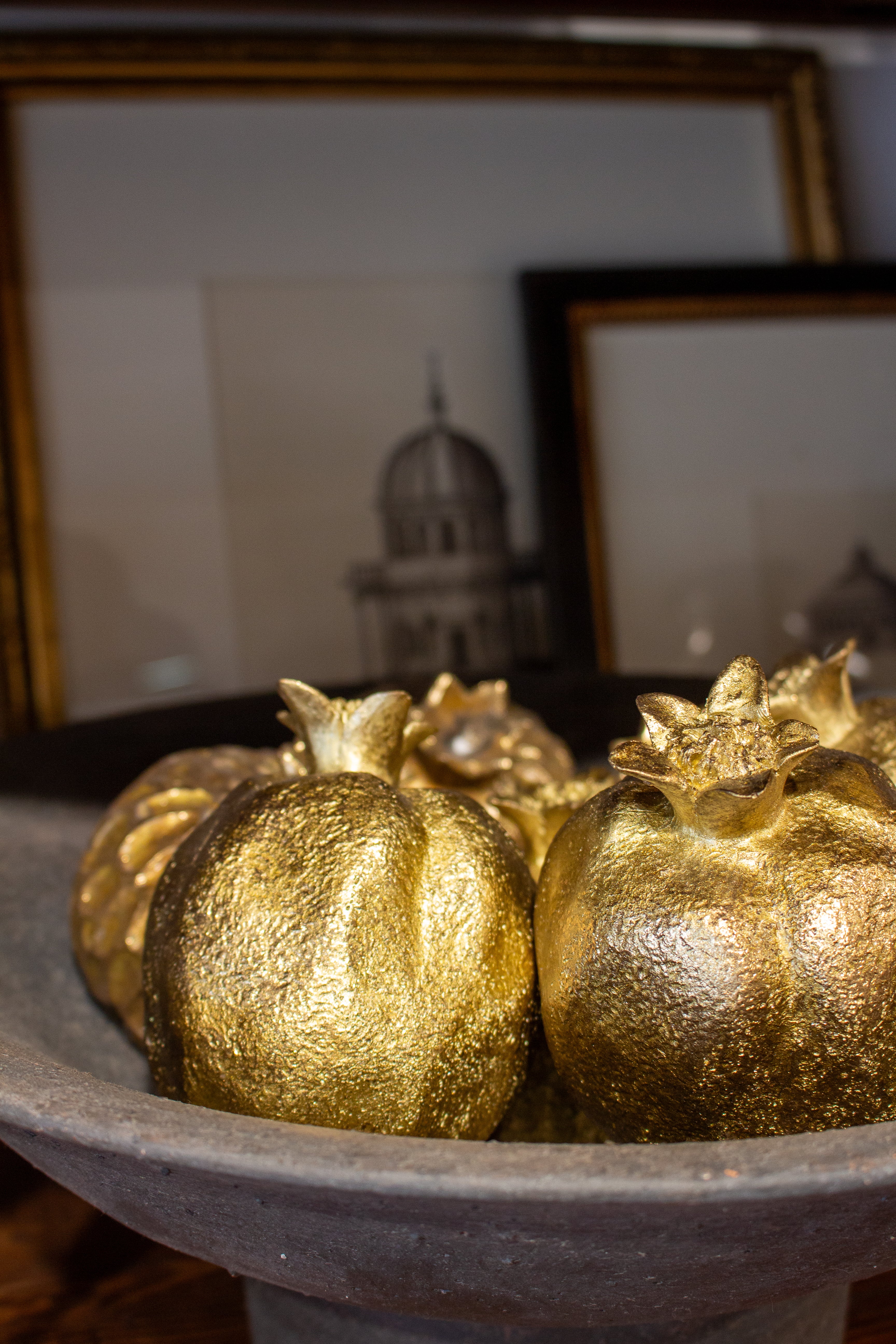 The Agnes Small Pomegranate Sculpture is a charming decorative piece crafted from resin, designed in the shape of a pomegranate with a burnished gold finish.