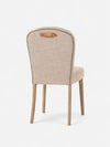 The Amberley Dining Chair features a natural color and a seat crafted from a poly/cotton mix for comfort and durability. It includes a top grain leather handle on the back for a touch of elegance. The frame is made from ash wood, known for its strength and classic appeal. The chair is accented with detailing studs, adding a refined touch to its design.