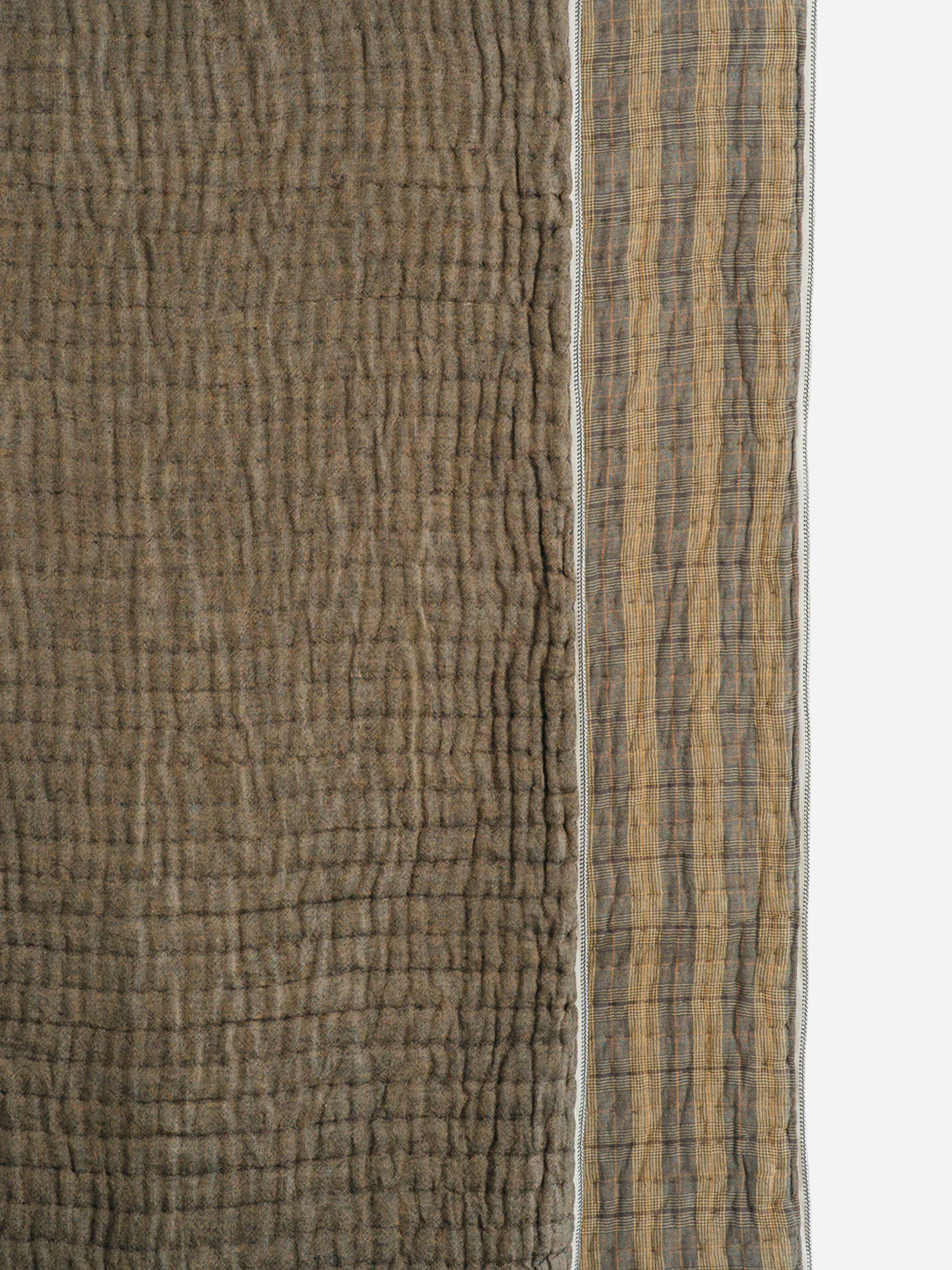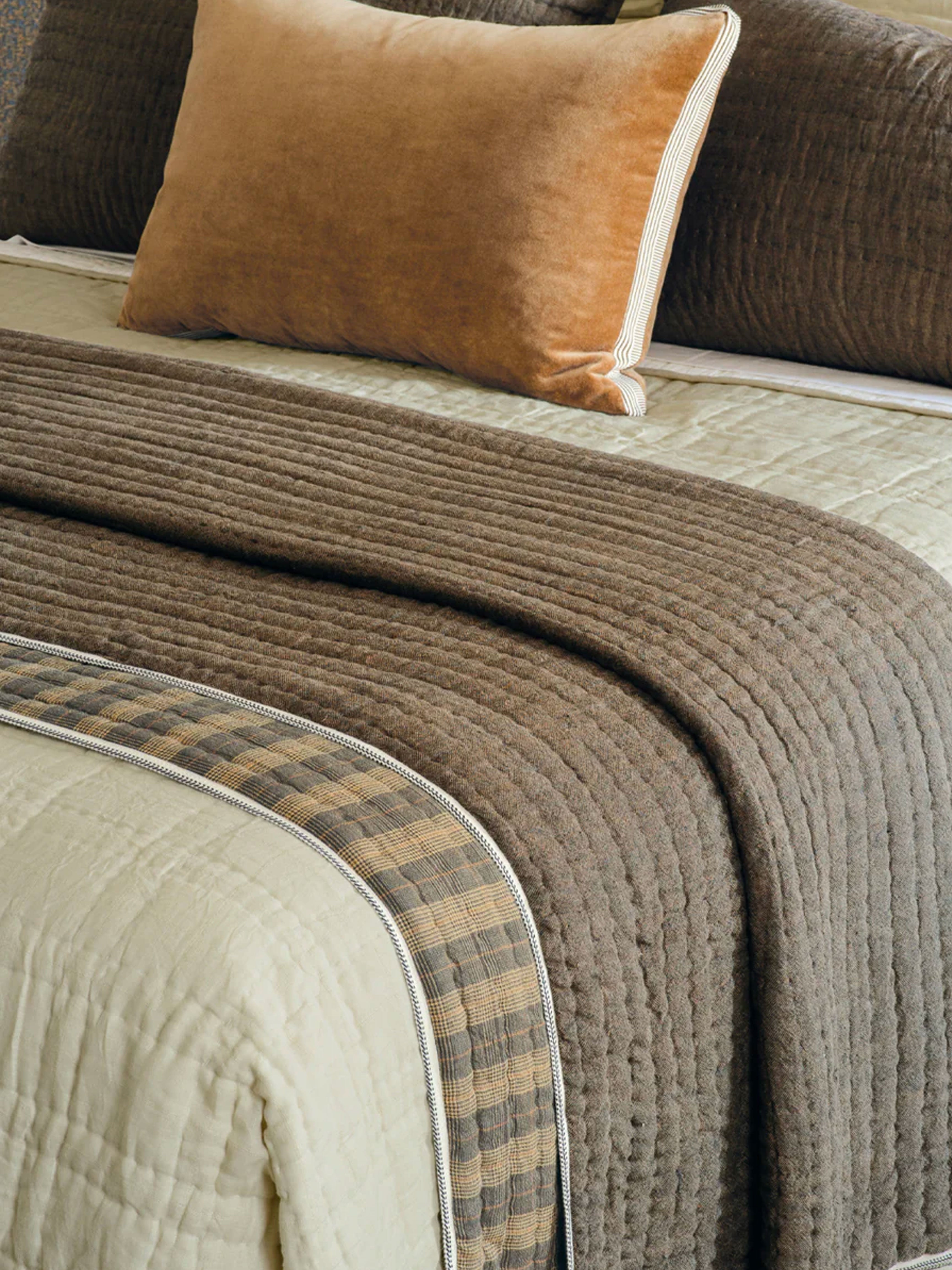 The reversible Appetto copper coverlet weaves tales of Scottish history and landscapes. Hand quilted to play with light and shadow, it features a 100% linen front in a rich copper soft washed chambray, mimicking rugged peaks with conversations of artisans echoing in every last stitch. The 100% cotton reverse reveals a dynamic plaid of copper, chocolate, and hazel — a nod to the patterned fabrics of the Highlands. Filled with cotton wadding for added texture and comfort, the design is finished with a striking ivory and black woven ribbon trim, offering a refined final touch.