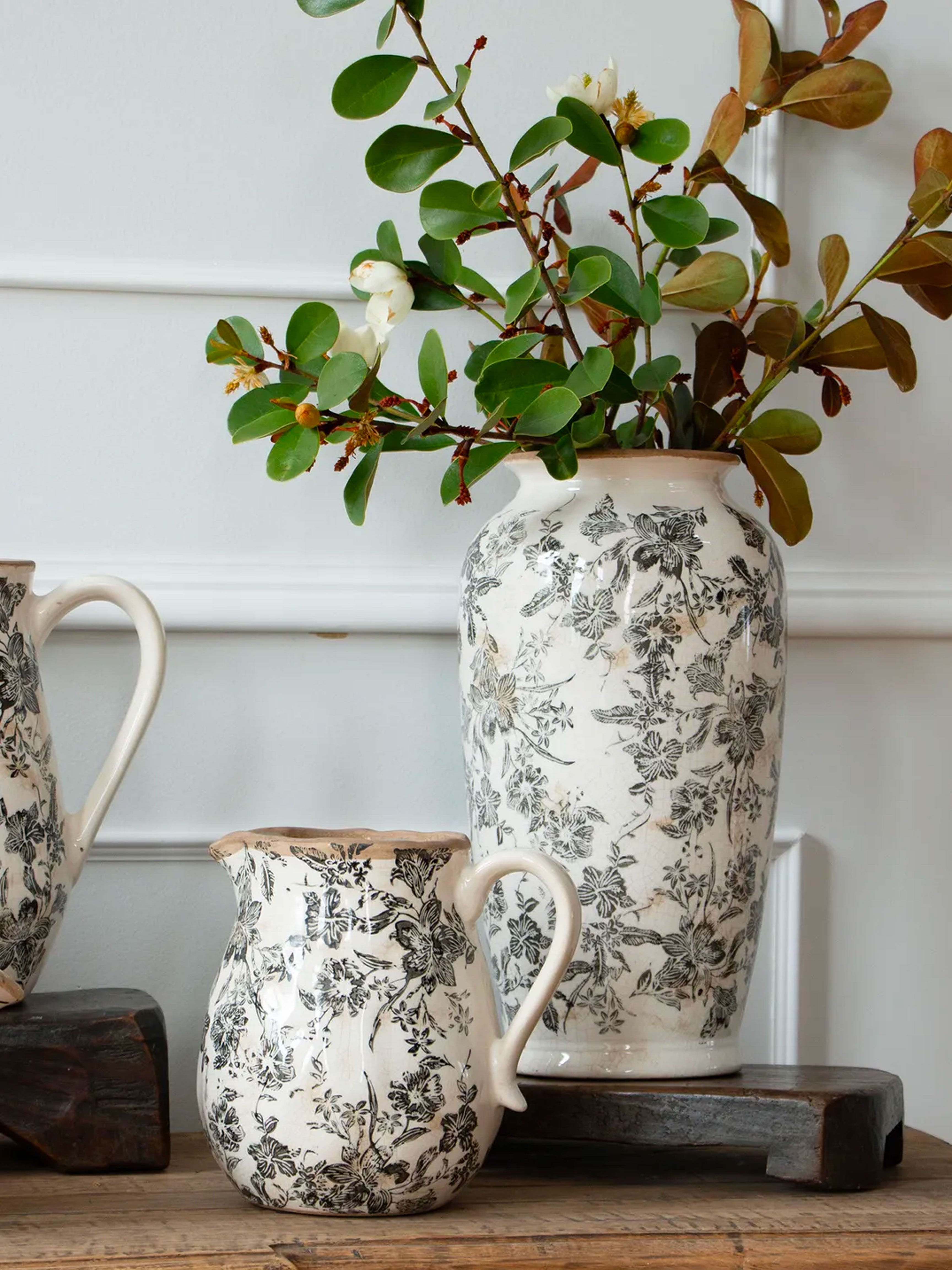 Our latest addition to our floral garden pot collection; these beautifully crafted black and cream stoneware planters and vases feature an intricate hand-stamped print that blends seamlessly into any French country or farmhouse-inspired décor. With intricate vintage detailing, this vase can be used to display fresh blooms, or dried flowers effortlessly adding a serene, nature-inspired touch to your indoor and outdoor spaces. Style indoors or out to bring natural charm to your home and garden. Embrace the spirit of French countryside elegance with planters that combine beauty with functionality.