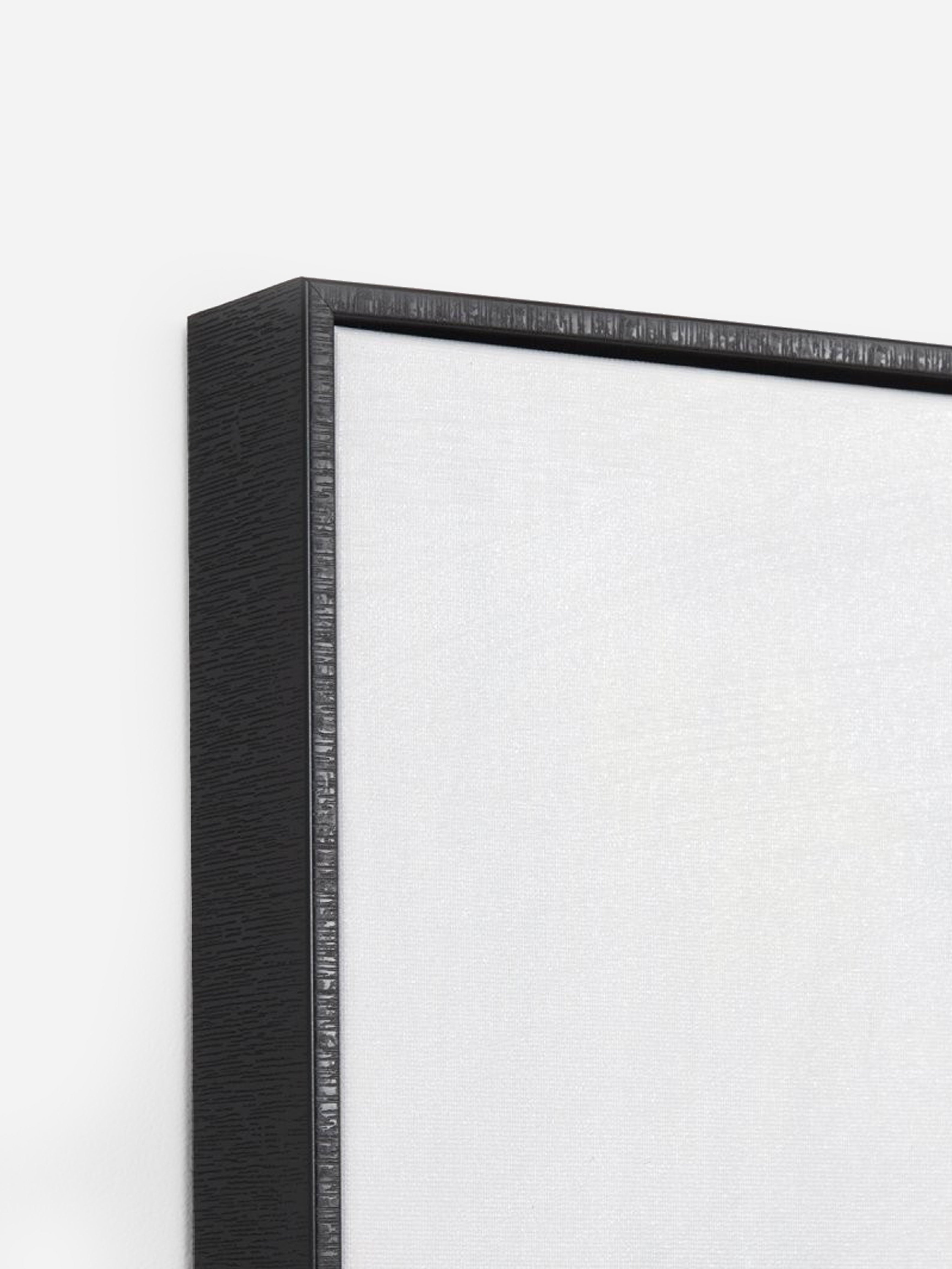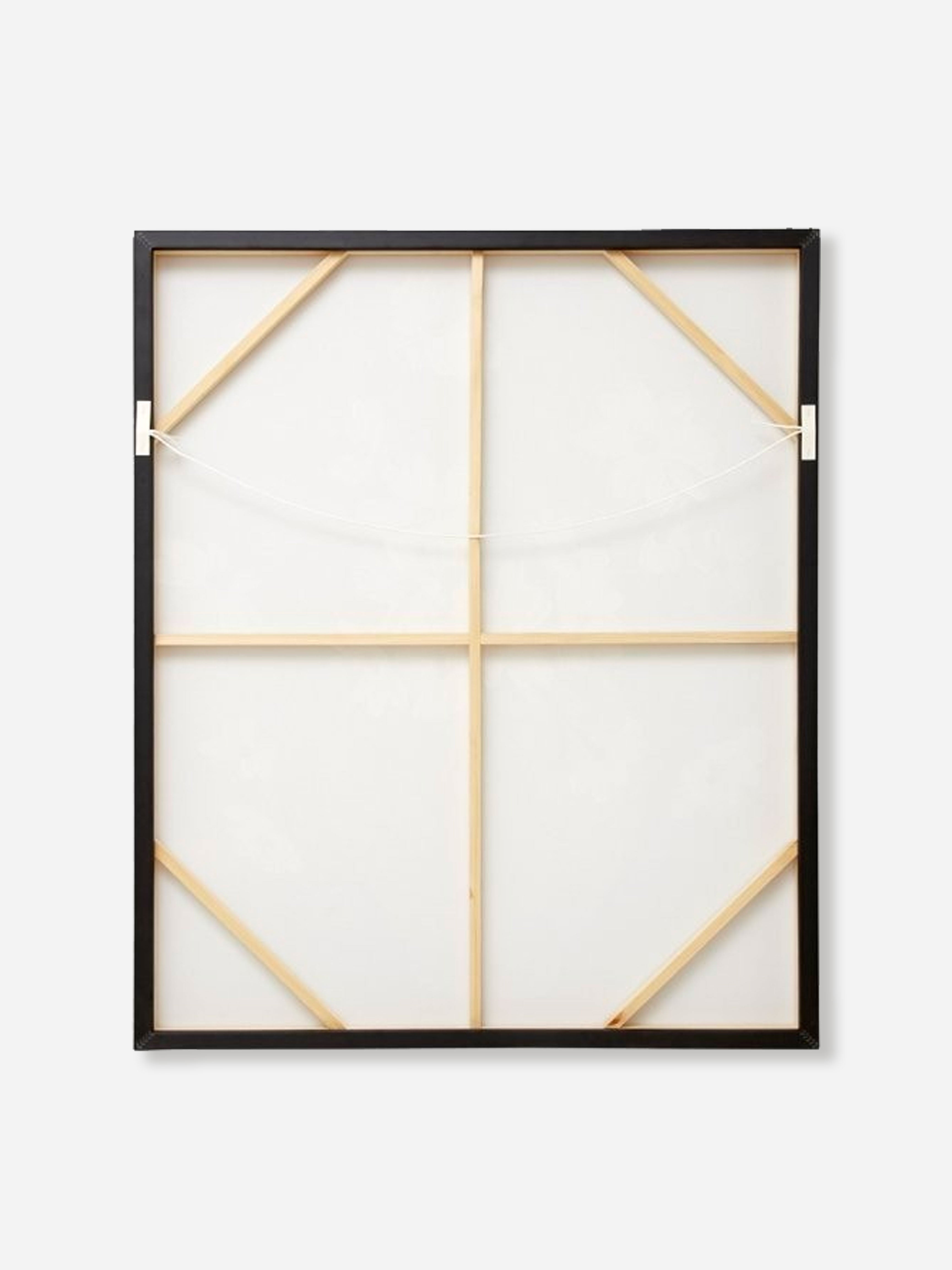 Stretched cotton blend canvas, timber veneer outer frame, pine stretcher backing frame. Strung with cord and ready to hang.