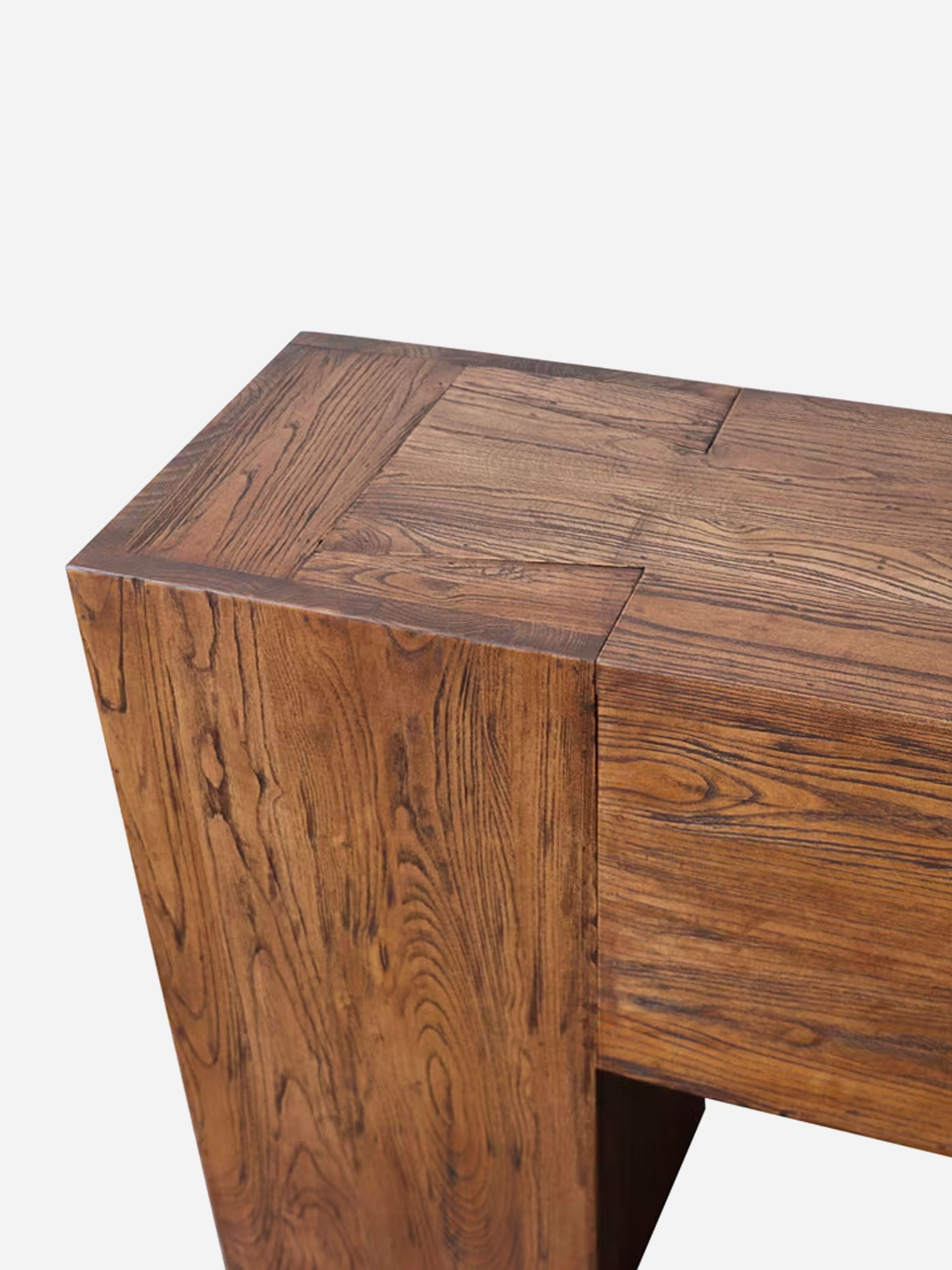 The Dovetail Block Console in antique black elm and reclaimed elm combines rustic style with unique craftsmanship. The antique black finish highlights the wood’s natural grain, while the dovetail block design adds a distinctive, artisanal touch. Ideal for entryways or living spaces, this console brings character and elegance to any interior. Crafted from reclaimed elm in a walnut tone.