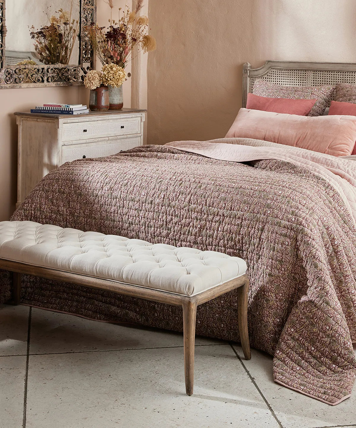 The elegant Florence oak long stool is upholstered in a natural linen and cotton blend fabric with buttoned detailing. Perfect as a bedroom piece at the end of the bed, or as a window bench. Frame is crafted from solid birch wood.