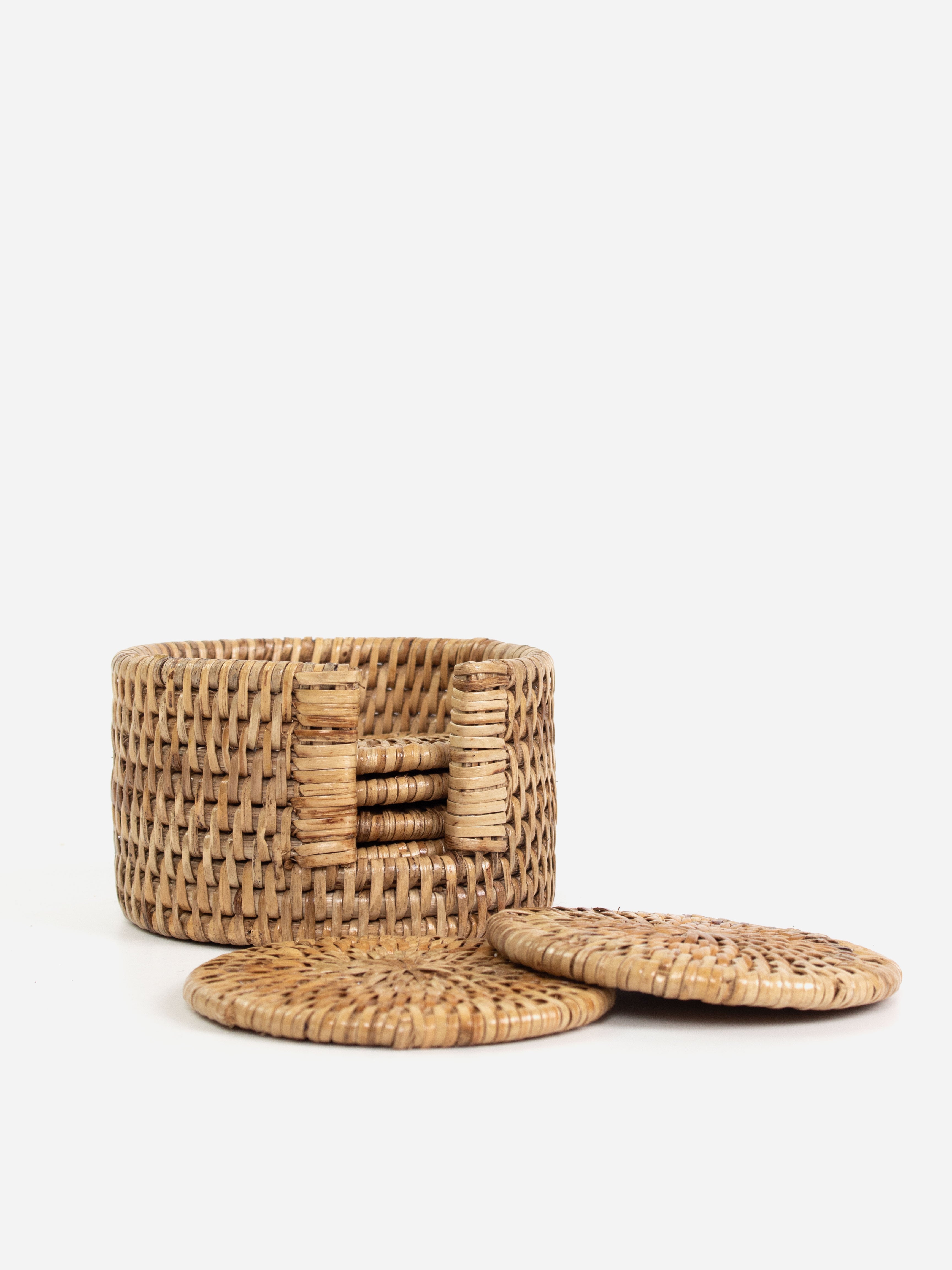 Elevate your home decor with the Harlow Round Coaster Set crafted from natural rattan. Protect your surfaces in style while adding a touch of organic texture to your living space.
