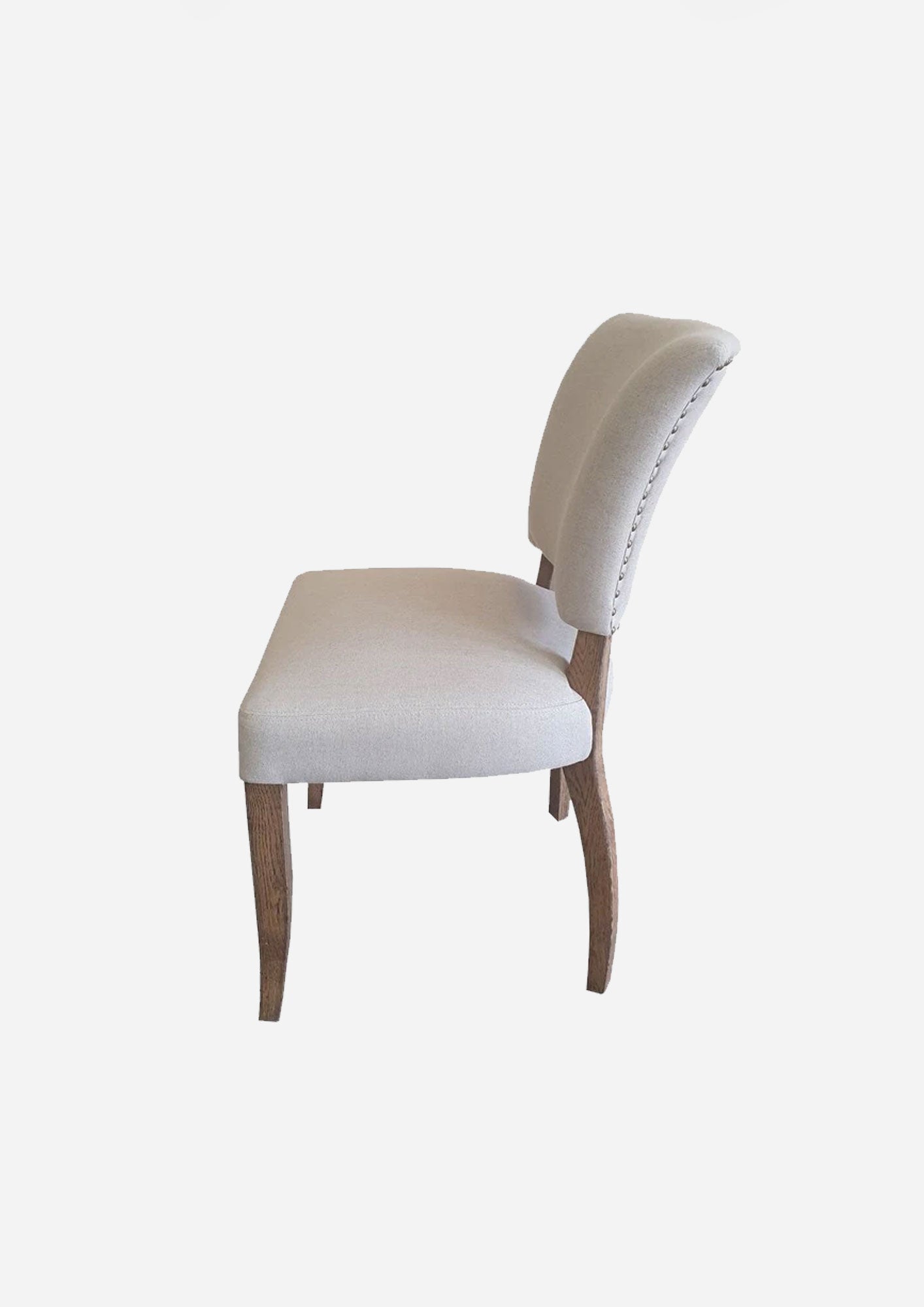These sLennon Dining Chair add just the right amount of luxury with soft linen fabric and brass studs lining the back of the chair, the solid waxed oak legs add heritage charm to any dining setting.