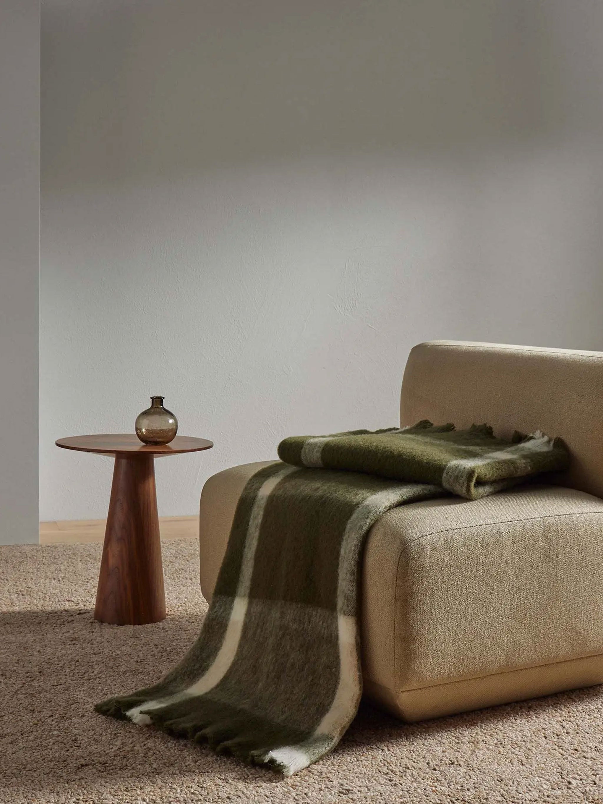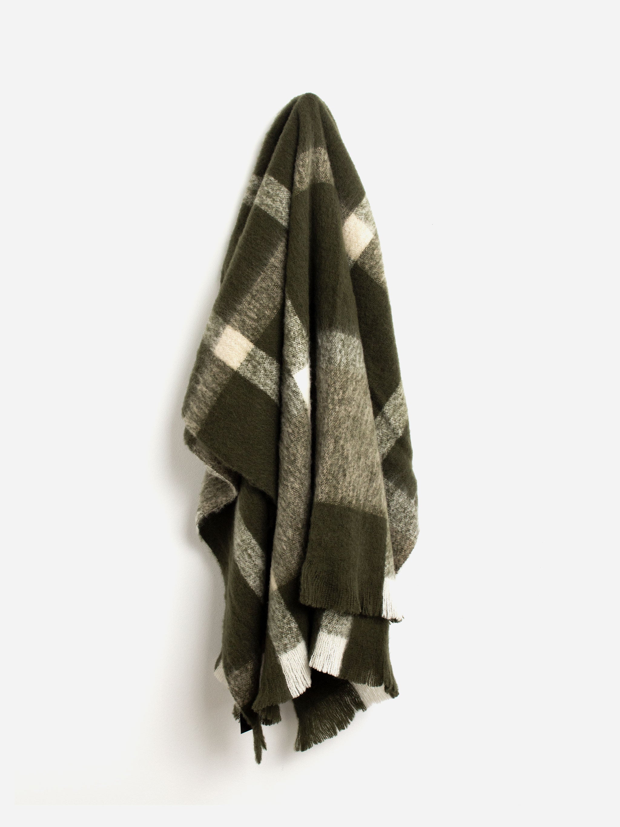 Classic and cozy, the Mayfield Olive Throw is woven from 95% New Zealand wool and 5% nylon, featuring a traditional check pattern in contemporary olive tones, with highlights of nougat and cream. Designed and made in New Zealand, this plush throw is finished with lightweight tassels for a relaxed yet refined touch. Sized at 130cm x 200cm, it's perfect for draping over sofas, chairs, or beds. Hand wash or dry clean recommended. Store indoors to maintain its quality.