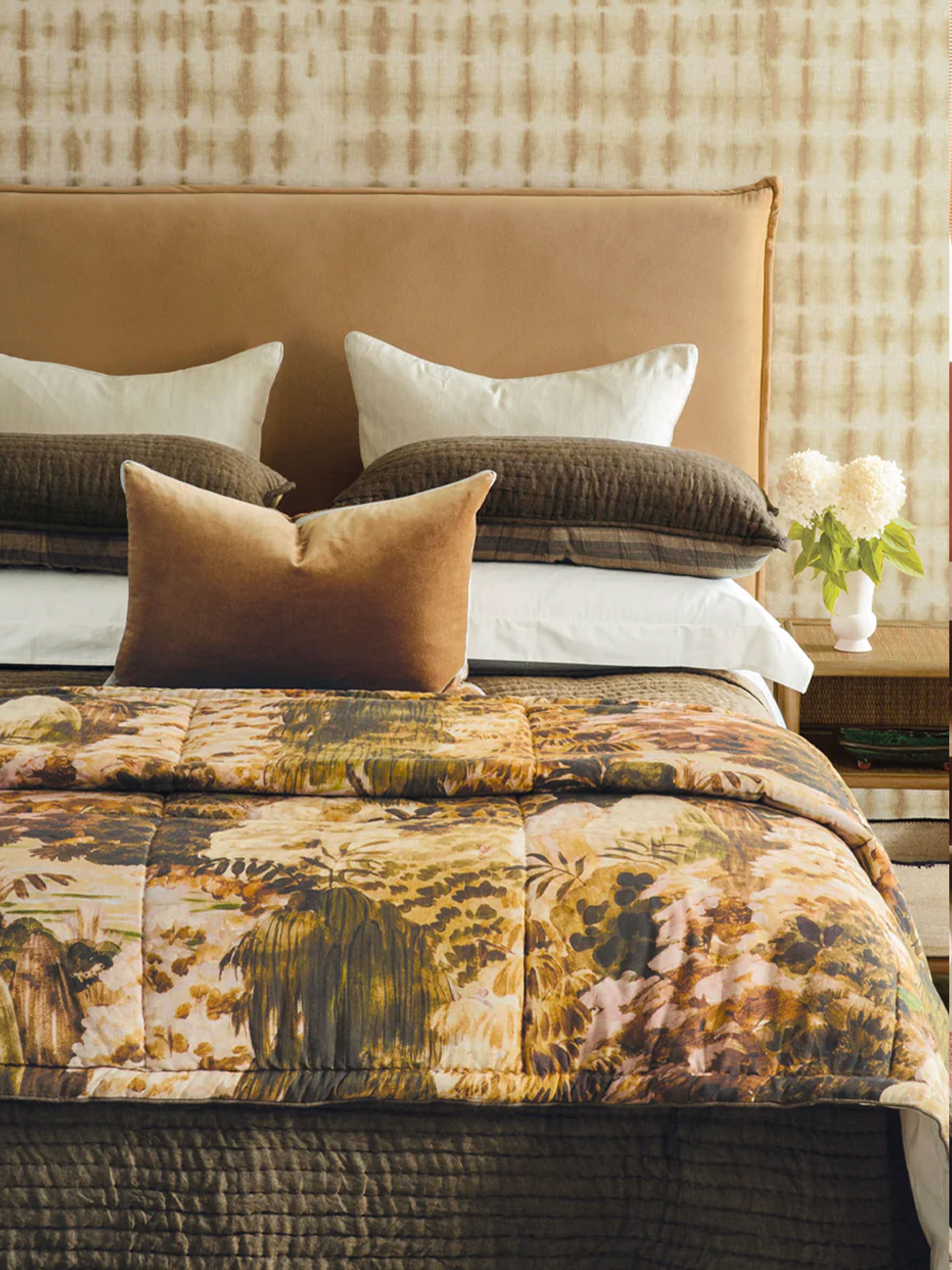 The reversible Misaka copper bedspread weaves tales of Scottish history and landscapes through its beautifully hand-quilted design. Crafted from 100% linen on the top and backed with a 100% cotton reverse, it features cotton wadding for added warmth and texture. The soft washed linen chambray in a rich copper tone catches light and shadow like the rugged Highland peaks. On the reverse, a dynamic plaid in copper, chocolate, and hazel offers a striking contrast, evoking the traditional patterns of the region. Every stitch reflects the touch of artisan hands, bringing warmth and story to your space.