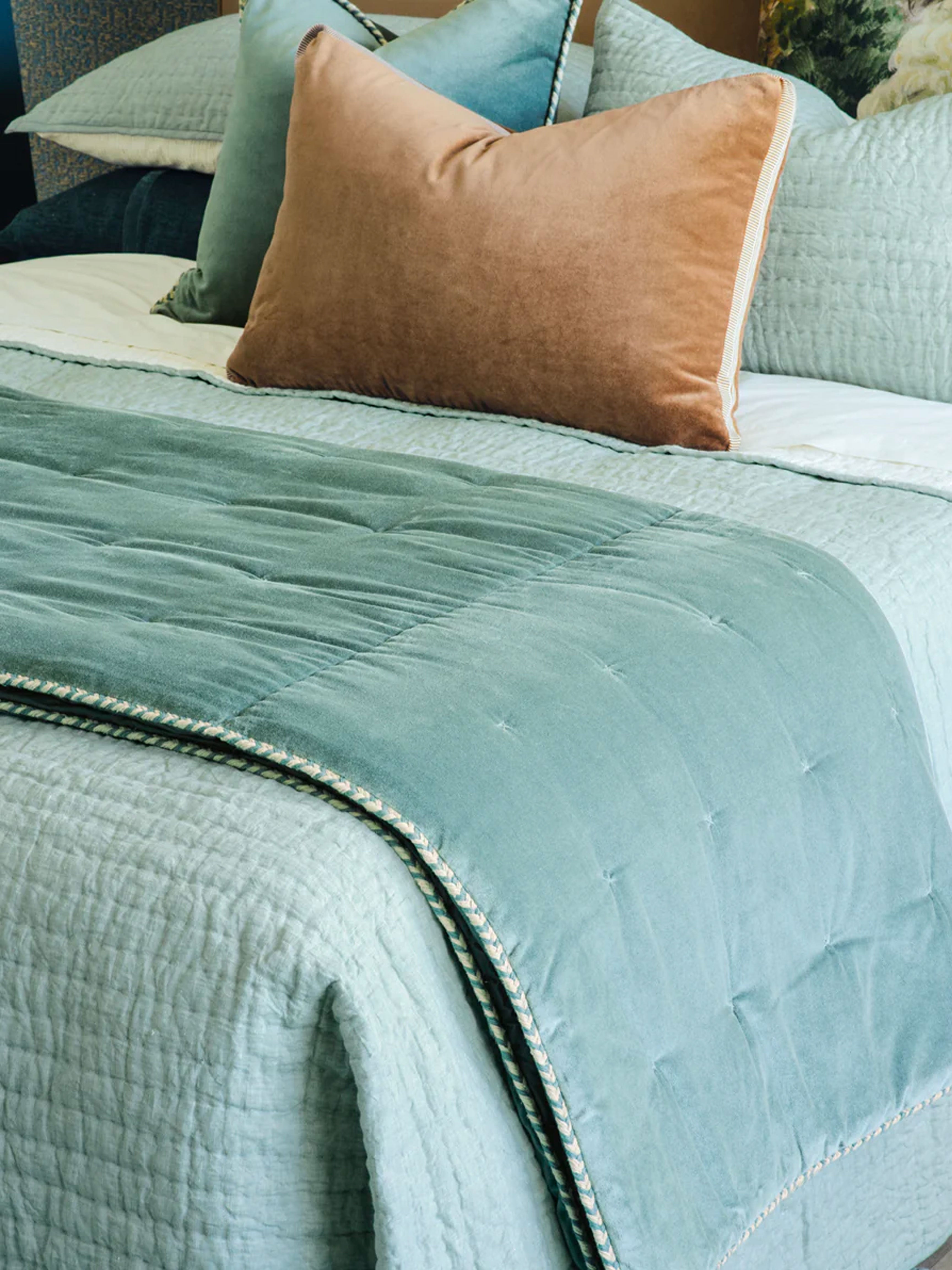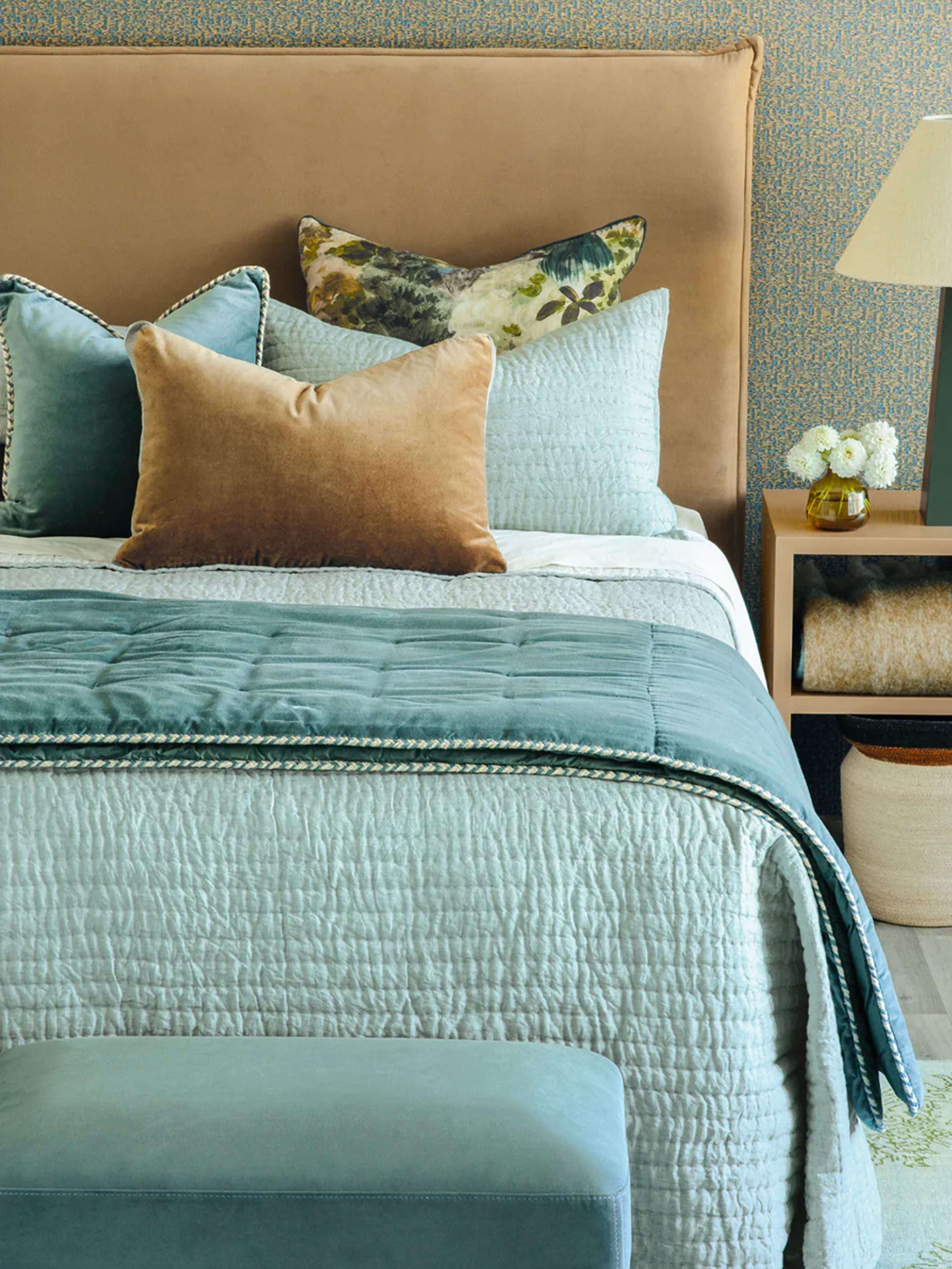 The reversible Misaka duck egg bedspread weaves tales of Scottish history and landscapes, with hand quilting that plays with light and shadow on a soft washed linen chambray in duck egg, mimicking ripples on a loch and echoing the conversations of artisans in every stitch. The reverse features a dobby weave textured stripe in ivory and duck egg, combining raised and lowered threads to create a beautifully tactile finish. Crafted with a 100% linen top, 100% cotton reverse, and cotton wadding.