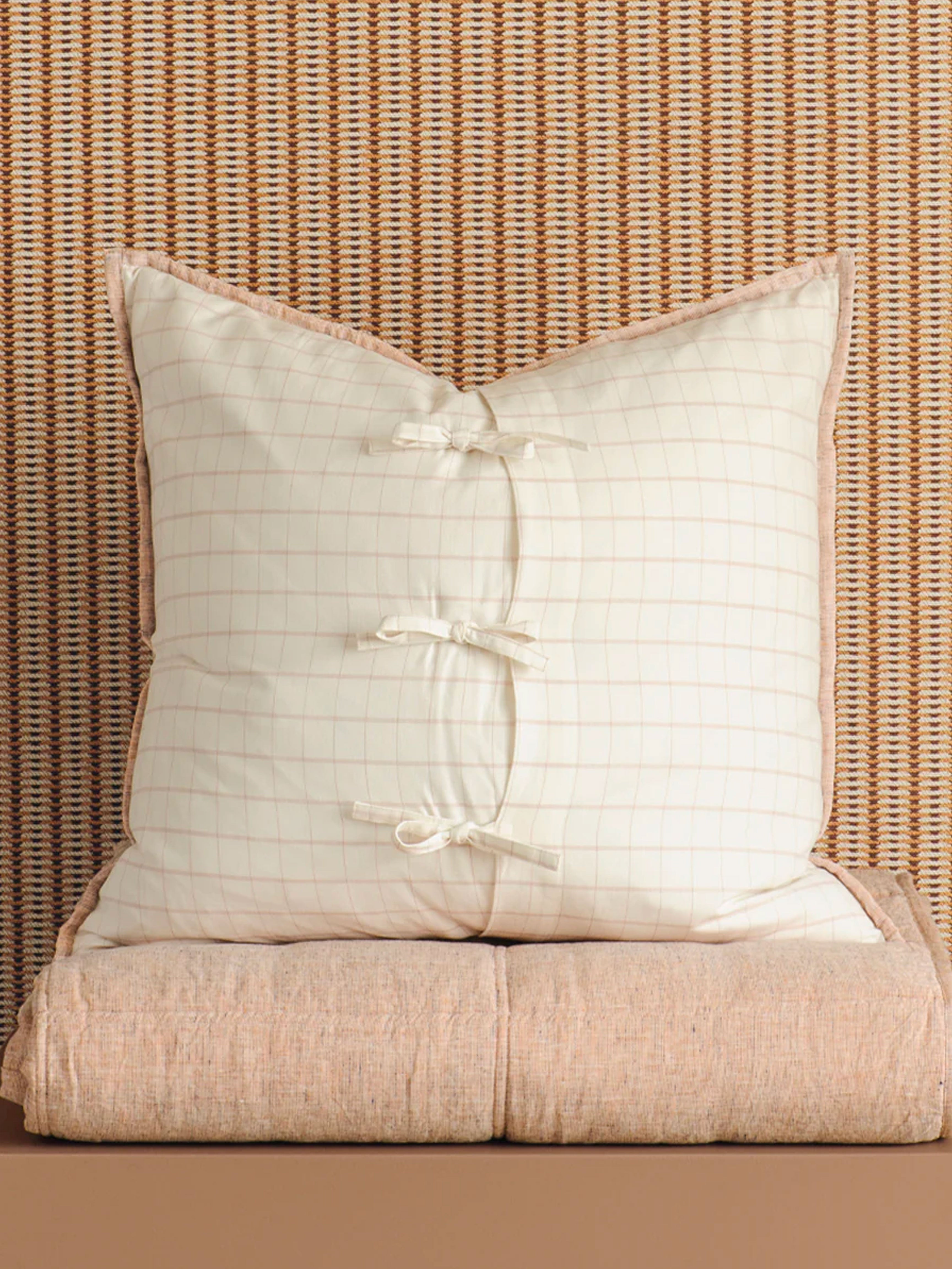 Noma Bellini is the protagonist, emitting a humble luminosity through its blend of indigo and bellini linen threads, bringing an energizing aura and a sense of perpetual spring to any room. Quilted in contemporary squares, the Noma euroshams offer a spatial elegance, while the 100% cotton reverse reveals a small woven check in ivory with bellini threads for added texture and charm. Crafted with a 100% linen front, 100% cotton reverse, and cotton wadding, each reversible eurosham is finished with a tie-back closure. Sold as a pair.